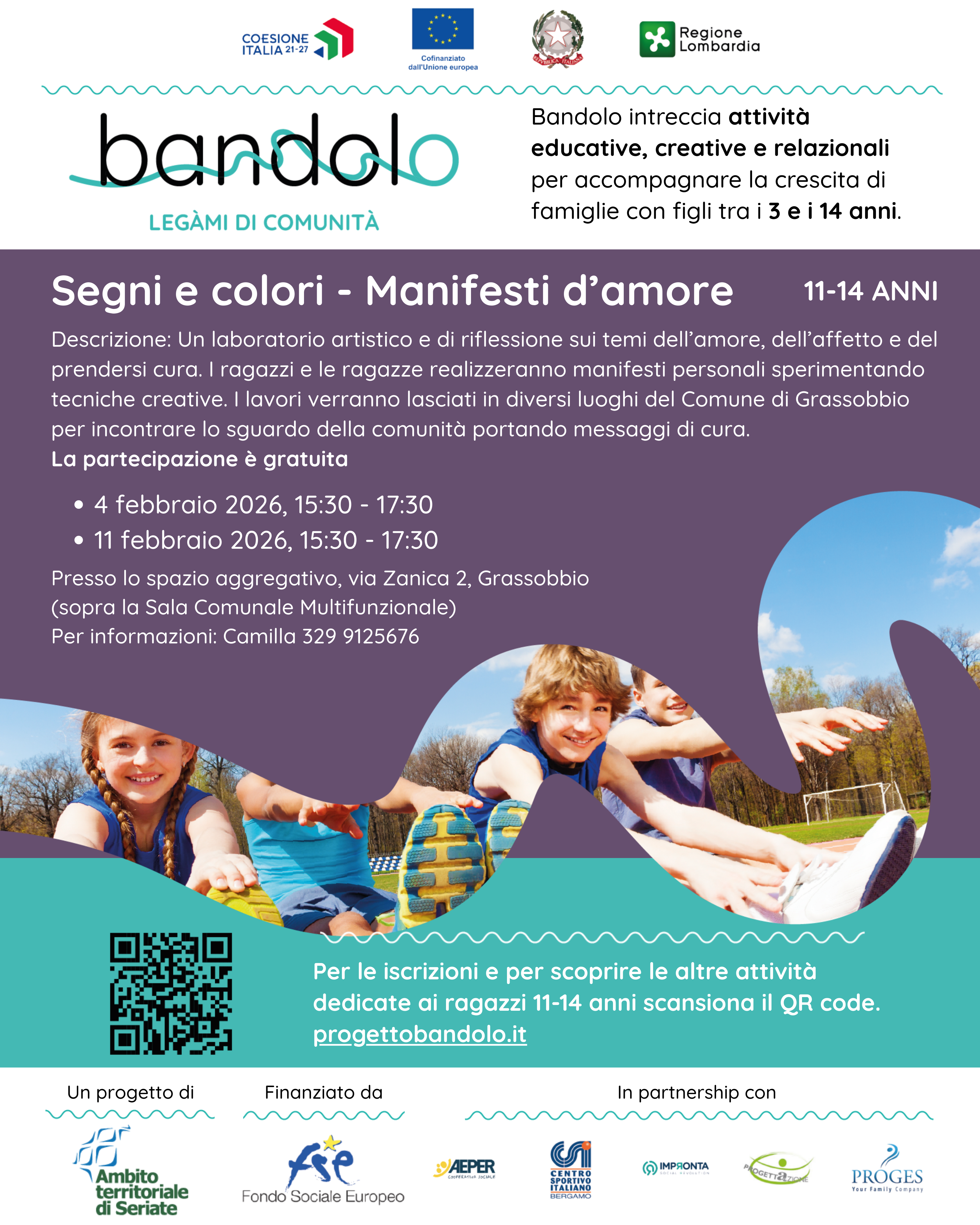 In via Zanica n. 2 sopra la sala Multifunzionale comunale di Grassobbio abbiamo 2 date in programma per i ragazzi tra gli 11 e i 14 anni per la realizzazione di un laboratorio sui temi di riflessione su amore-affetto-cura, evento gratuito.