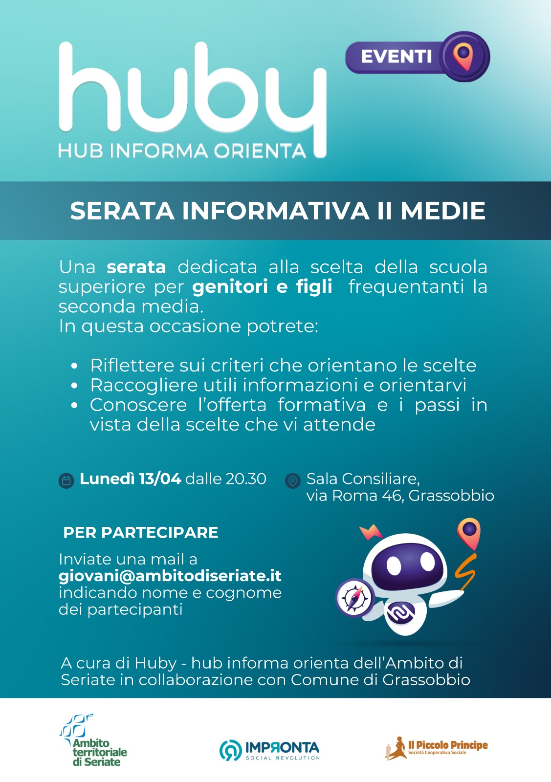 Serata informativa lunedì 13/04/2026 ore 20.30 Sala Consiliare Via Roma 46 Grassobbio rivolta alle classi seconde Scuola Secondaria di primo grado dedicata alla scelta della scuola superiore.